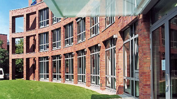 Dieses Bürocenter mit ca. 8.000 m² Geschossfläche haben wir auf einem ca. 8.000 m² großen Grundstück geplant. Das Gebäude hat einen kreuzförmigen Grundriss und 4 Etagen mit Staffelgeschoss. Jede Etage ist aufteilbar in 4 Mieteinheiten, an die Bürofläche im Erdgeschoss ist eine Servicefläche angeschlossen. Die Fassade wurde in Klinker ausgeführt und verfügt über außen liegenden Sonnenschutz.